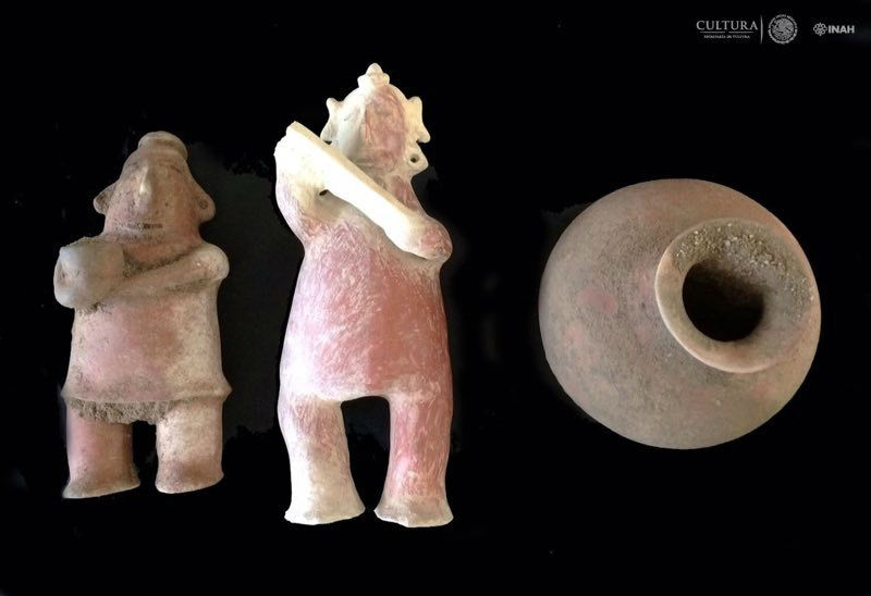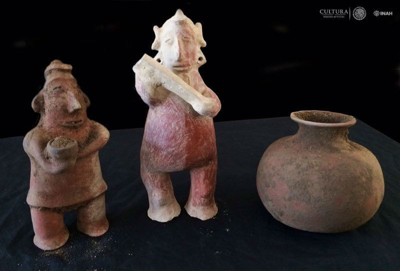 Los especialistas identificaron tres niveles de enterramiento, y en el segundo se encontró una ofrenda integrada por cuatro objetos cerámicos, entre ellas dos esculturas antropomorfas de rasgos masculinos y femeninos, respectivamente, dispuestos boca abajo en asociación directa a dos cráneos, a una profundidad de 1.60 m.