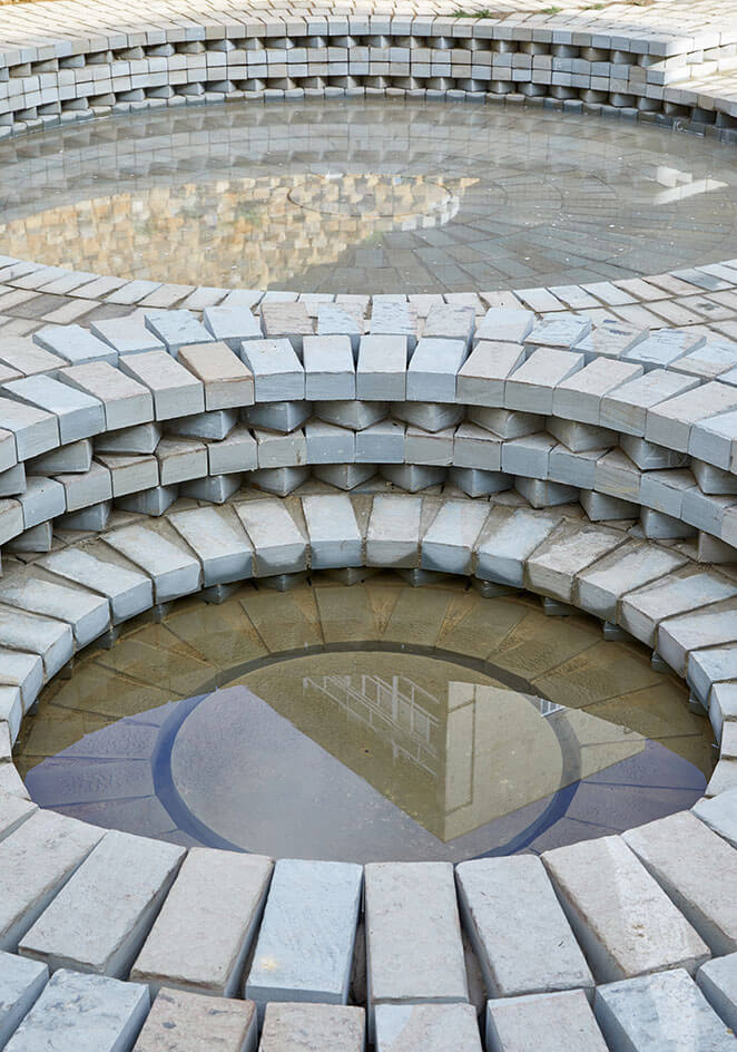 Se trata de una secuencia de espirales y círculos (estos últimos, un motivo recurrente en la obra de este artista). Un juego de geometría que converge y fluye entre sí. Desde las alturas la apreciación de este diseño es sorprendente, remite a un antiguo espacio de evocación ritual, quizá.
