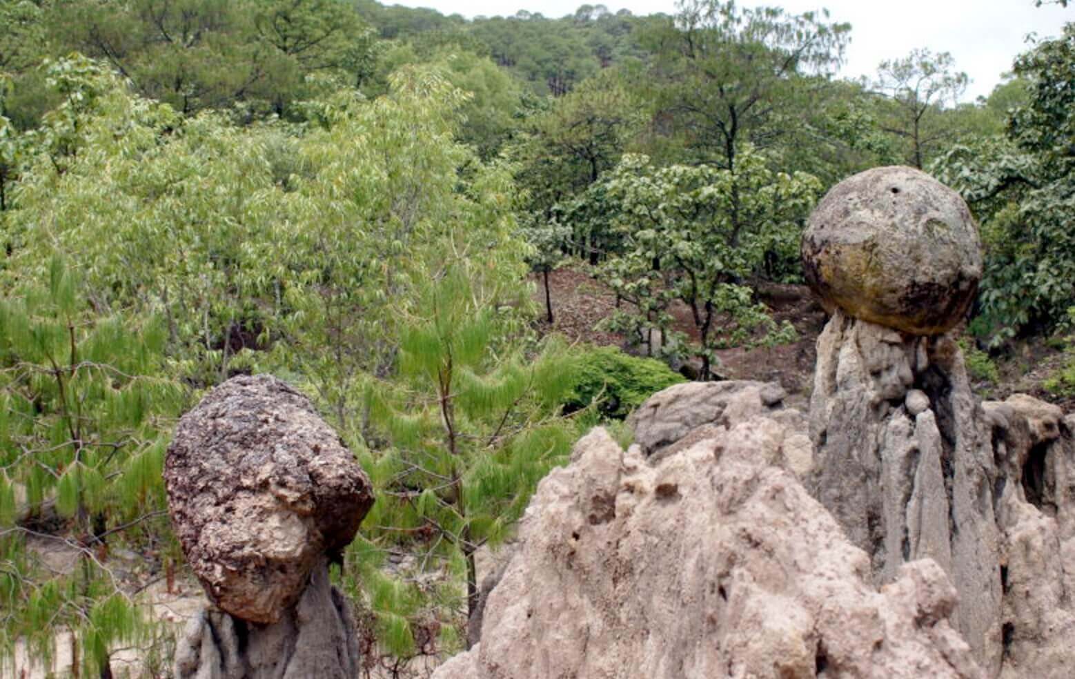 Las esferas están en la parte más alta de la Sierra, rodeadas de robles y algunos pinos. El sitio ha sido adecuado con puentes colgantes y para fortuna de todos es un espacio aún virgen. Los mismos ejidatarios de Santa Cruz de Bárcena son los que cuidan este lugar ubicado en el municipio de Ahualulco de Mercado.