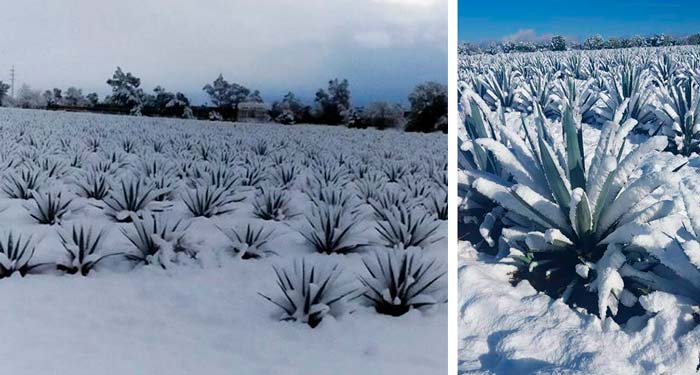 Ello provocó que en algunos sitios donde es extrañísimo que nieve, este fenómeno se diese, sorprendiendo y encantando, a muchos. El resultado estético son increíbles imágenes con escenarios improbables: como agaves en sus hermosos patrones en hileras cubiertos de nieve, un binomio visto con escasísima regularidad.