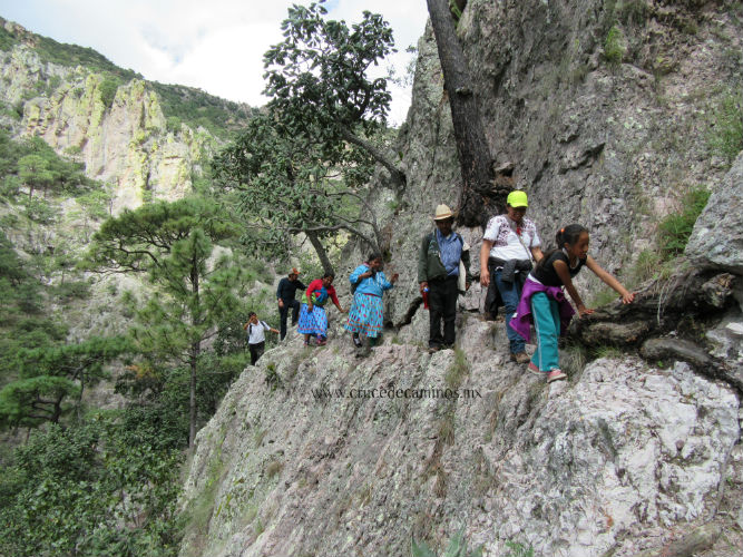 Al día siguiente inició una travesía a pie hacia la comunidad de Rowerachi que se encontraba del otro lado del barranco, el caminar por brechas y travesías represento parte importante de este encuentro que permitió ver los pasos que durante miles de años los Rarámuri han recorrido para construir su comunidad y su cultura. En el camino se observaron cuevas que son habitadas en la época de invierno, pequeñas tierras sostenidas por trincheras ancestrales, piedras monumentales que se asemejaban a guardianes de la tierra, disfrutaron de las aguas termales al fondo del barranco y finalmente batieron pinole tal y como lo hacen ellos, lo de ahí.