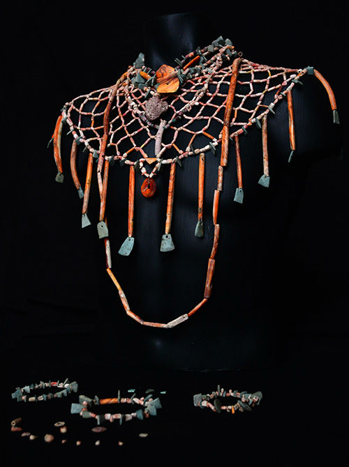 En esta misma área, un grupo de arqueólgos encontró miles de cuentas de concha que pertenecían a uno de los ornamentos más populares en la humanidad: los elegantes pectorales. Este equipo, formado por Luis Alfonso Grave Tirado y Dina Gabriela Basurto Félix, consiguió primero dar cuenta de que estas formaban parte de un collar, y luego dieron sentido geométrico siguiendo la lógica de estas piezas.
