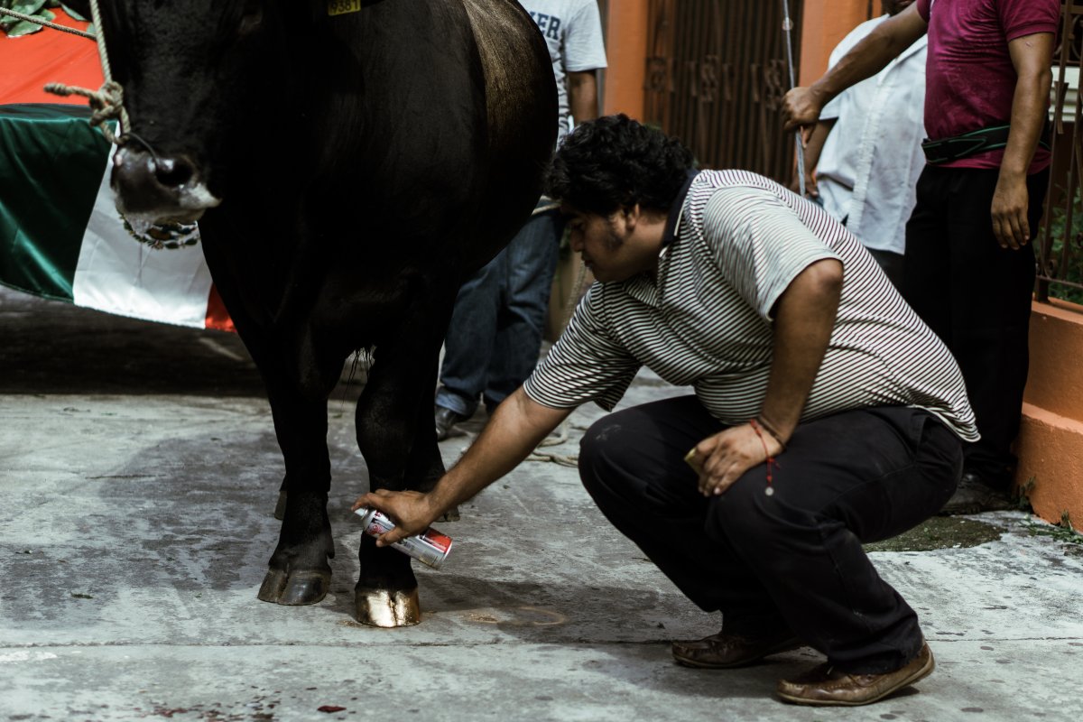 “… con la mano derecha toma un óleo de Miguel Hidalgo, mientras que con la izquierda hace lo propio con la bandera de México. Los toros que jalan la carreta son pintados con aerosol de color dorado.